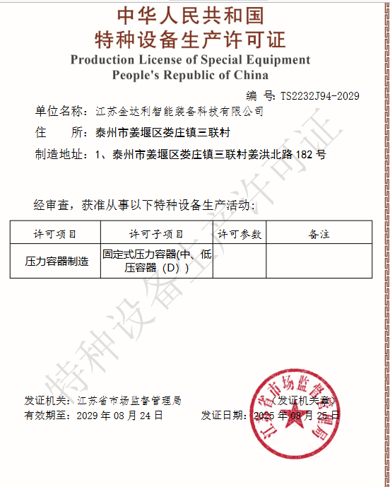 江苏金达利智能装备科技有限公司产品压力容器获得中华人民共和国特种设备生产许可证!