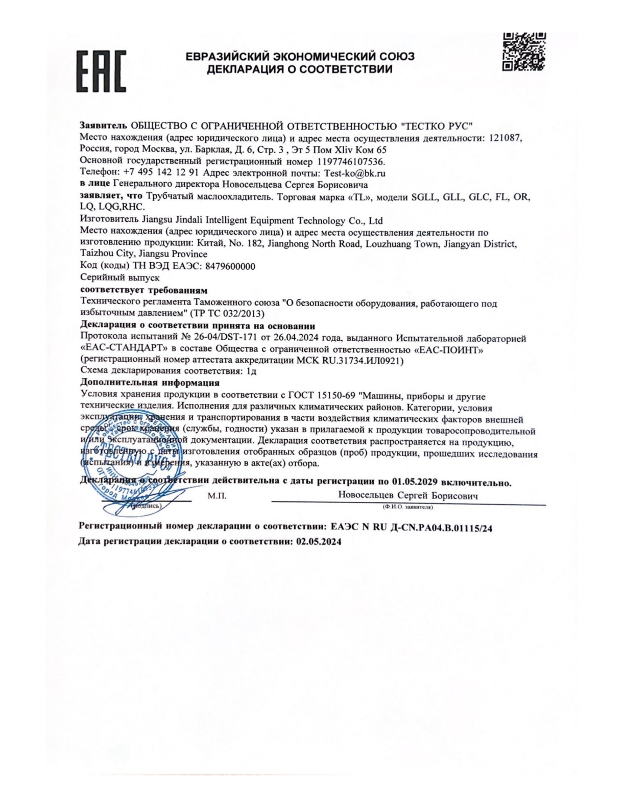 Jiangsu Jindali Intelligent Equipment Technology Co., Ltd. products obtained Russian E A C certification